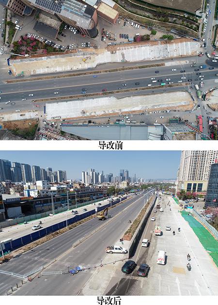 昆明市三環(huán)閉合工程?hào)|三環(huán)A段位于城市核心區(qū)域,施工路段為城市交通主干道,車流量大,周邊人口密集,施工期間道路保通任務(wù)艱巨。為確保交通導(dǎo)改順利實(shí)施,項(xiàng)目部科學(xué)規(guī)劃,精準(zhǔn)布局,將昌宏西路北段原雙向三車道分別向兩側(cè)平移,并通過新建永臨結(jié)合道路保障車輛通行。