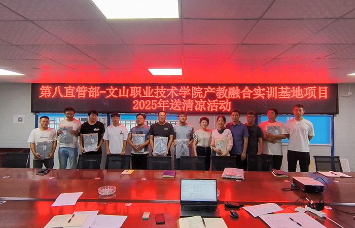 7月18日,第八直管部工會到文山職業(yè)技術(shù)學(xué)院產(chǎn)教融合實(shí)訓(xùn)基地項目開展2025年送清涼活動,為堅守一線職工發(fā)放了防曬服,送上直管部工會最真摯的關(guān)懷?;顒又行麄鹘庾x《云南省總工會關(guān)于建立健全幫扶長效機(jī)制的意見》文件內(nèi)容,向參會人員普及《防暑降溫小貼士》知識,提醒廣大職工及產(chǎn)業(yè)工人密切關(guān)注天氣變化,做好高溫天氣下生產(chǎn)、生活作業(yè)防暑降溫措施的準(zhǔn)備?;顒由咸岢?,一是直管部工會和項目部將聯(lián)動開展工作,加強(qiáng)對項…